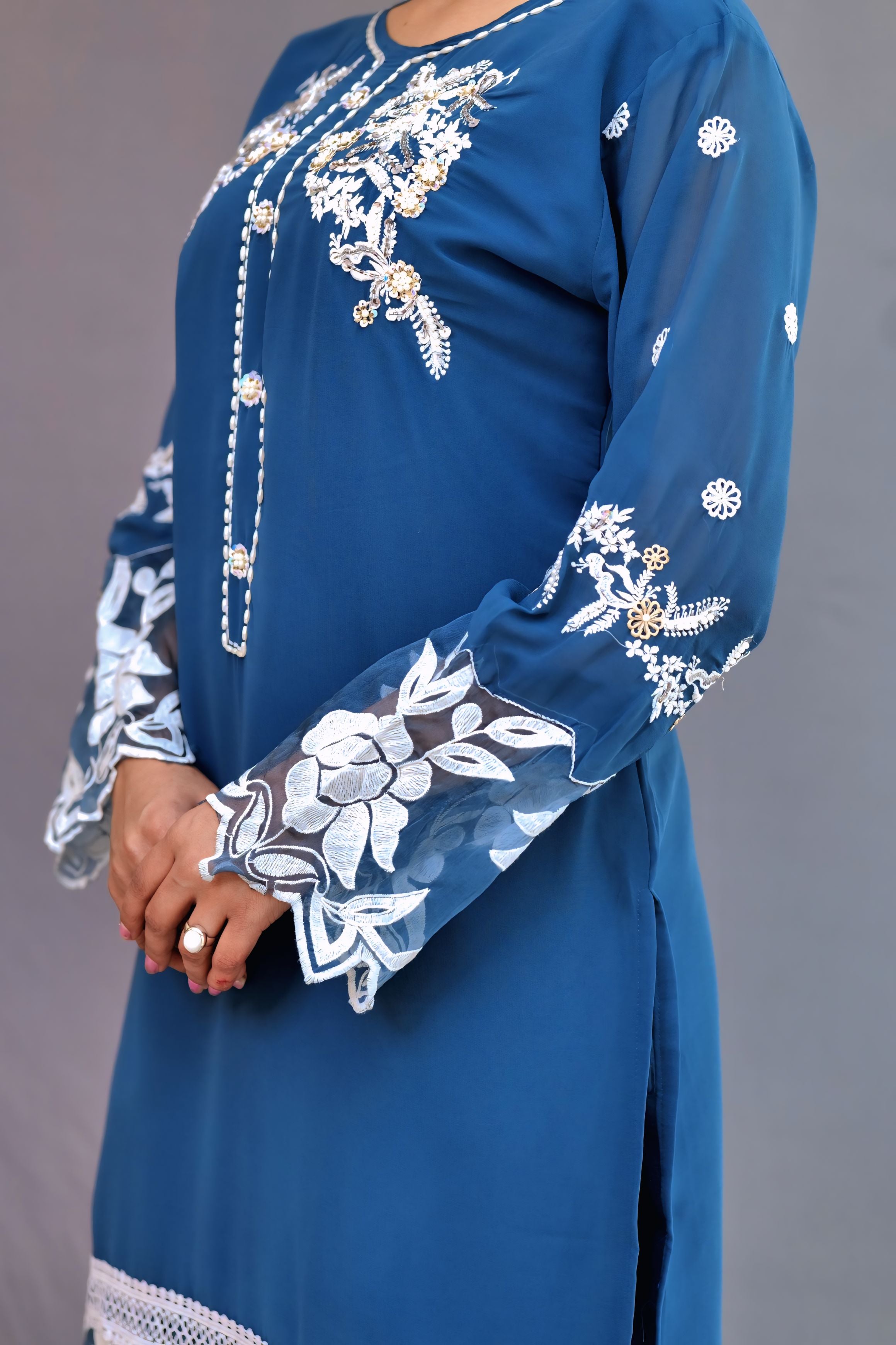 A traditional yet contemporary sharara set with a short kurti, featuring intricate thread embroidery and a stylish net dupatta.