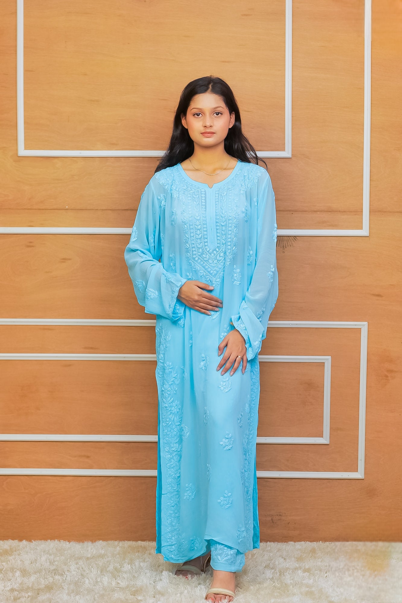 Cool and charming, this sky blue lawn suit with pastel embroidery and a flowing chiffon dupatta is ideal for summer celebrations and casual chic styling.