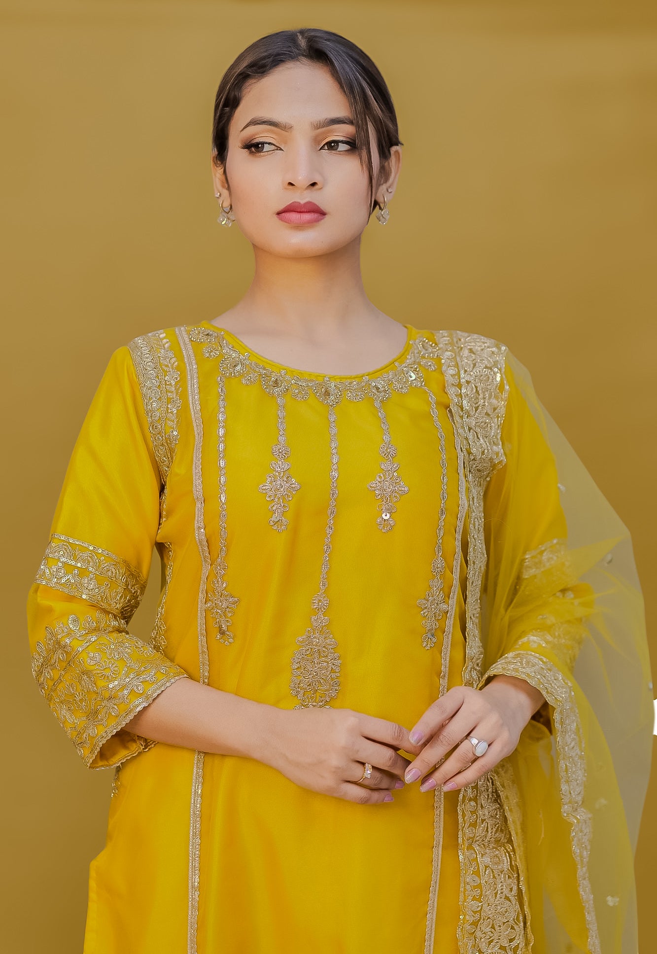 Brighten up your wardrobe with this sunshine yellow suit, featuring delicate thread embroidery and a chiffon dupatta. A perfect pick for festive mornings and haldi ceremonies.